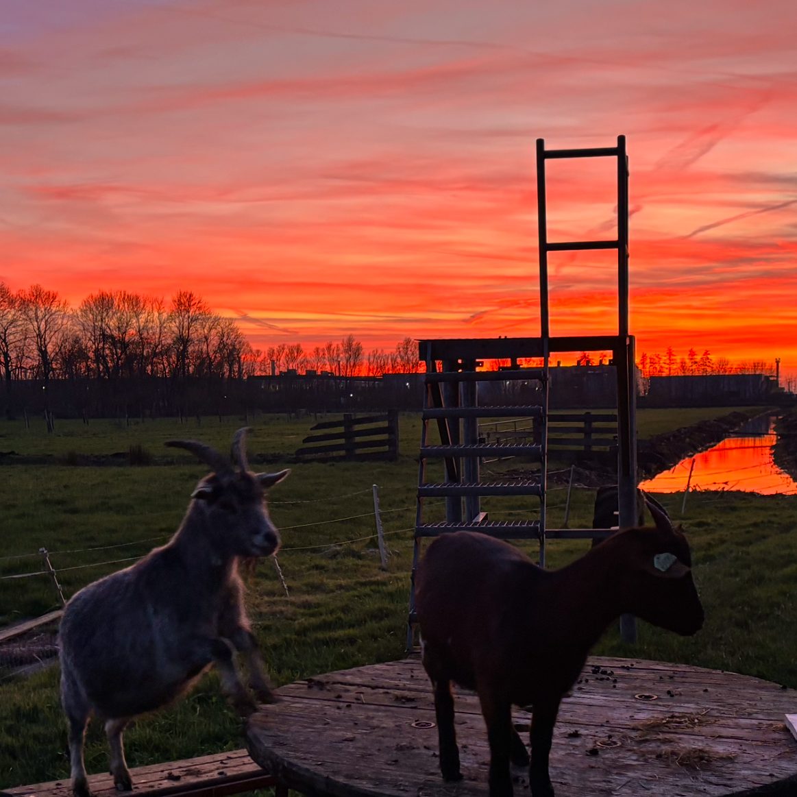 De zonsopkomsten boven het Zwarte Water leveren doorgaans prachtige beelden op. Vandaag is ook de zonsondergang echt de moeite waard om te delen. Ook onze gasten waren enthousiast. Vraag blijft natuurlijk in hoeverre onze geiten dit hebben kunnen waarderen.